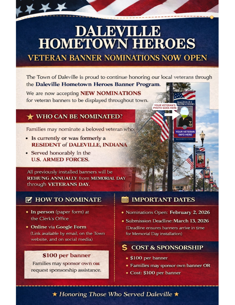 The Town of Daleville is proud to announce that nominations are now open for the 2026 Daleville Hometown Heroes Veteran Banner Program. This program honors local veterans by displaying personalized banners throughout town each year from Memorial Day through Veterans Day.